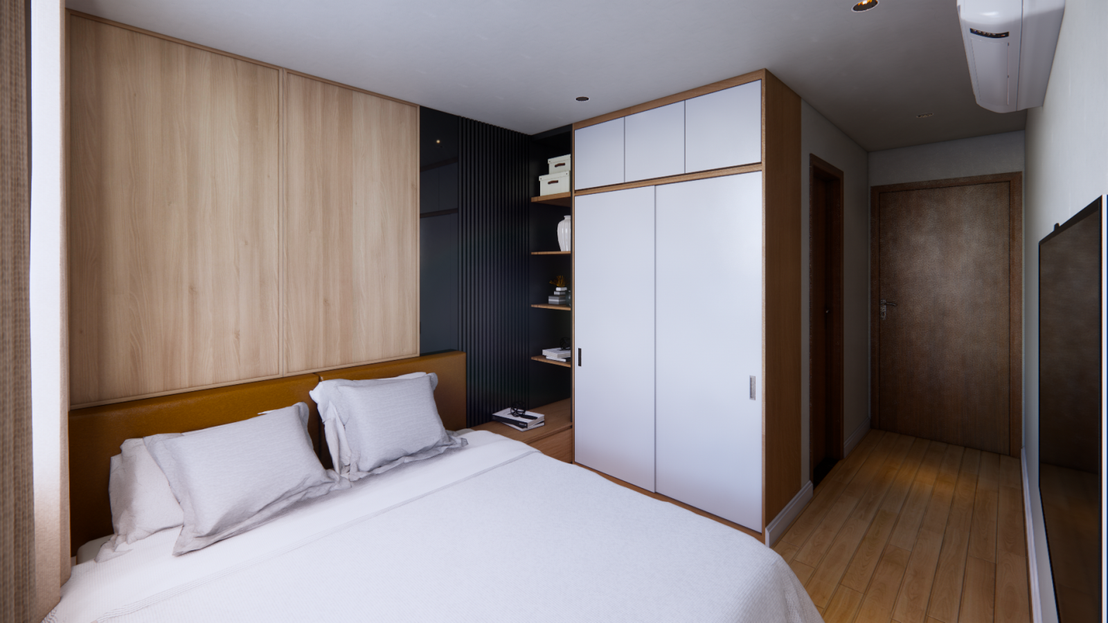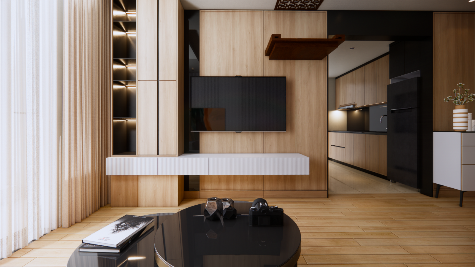Sau khi khảo sát cũng như tiếp nhận đề bài của anh chị cho chúng tôi, chúng tôi đánh giá căn hộ ít khi có người ở vào các ngày trong tuần nên chúng tôi chọn tông chủ đạo một tông màu gỗ ánh hồng tạo cảm giác ấm áp cho căn hộ giảm không khí lạnh lẽo, kết hợp với những chi tiết màu đen để các chi tiết tinh tế hơn. Phòng khách chúng tôi chọn một chiếc sofa thật lớn, rộng rãi để có thể thoải mái thư giãn trên sofa mà không bị quá chật chội. Tại vị trí bàn ăn của căn hộ chung tôi sử dụng một mảng gương lớn để tạo cảm giác không gian căn hộ rộng hơn. Diện tích căn hộ không quá lớn nên chúng tôi không quá ưu tiên những diện tủ lớn tạo cảm giác ngột ngạt thừa thãi, các mảng vách lớn được ưu tiên hơn. Các tủ chúng tôi cố gắng tối ưu hóa công năng tủ để đảm bảo cho anh chị vẫn đủ diện tích để chứa đồ. Tuy nhà ít được sử dụng nhưng trong bếp chúng tôi vẫn thiết kế đảm bảo công năng sử dụng cho anh chị. Chúng tôi muốn có một căn bếp đầy đủ tiện nghi để anh chị có thể về nhà cuối tuần và sinh hoạt như một căn hộ bình thường. Phòng ngủ chính của anh chị chúng tôi chủ ý nhắc lại chi tiết ở phòng khách để tạo một sự thông suốt cho căn hộ từ phòng khách đến phòng ngủ. Chúng tôi không chủ ý đặt Tivi tại phòng ngủ mà tư vấn cho anh chị một chiếc Tivi lớn ở phòng khách vừa đề anh chị có không gian xem Tivi riêng ở phòng khách tránh ảnh hưởng đến giấc ngủ vừa là để khi con chị từ Hà Nội về có thể cùng bố mẹ ngồi xem Tivi ở phòng khách, gắn bó gia đình nhiều hơn.