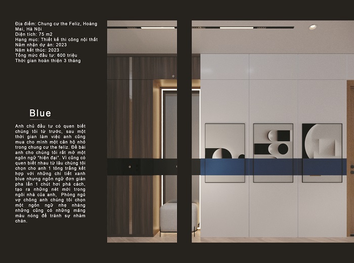Anh chủ đầu tư có quen biết. chúng tôi từ trước, sau một thời gian làm việc anh cũng mua cho mình một căn hộ nhỏ trong chung cư the feliz. Đề bài anh cho chúng tôi rất mở một ngôn ngữ "hiện đại". Vì cũng có quen biết nhau từ lâu chúng tôi chọn cho anh 1 tông trắng kết hợp với những chi tiết xanh blue nhưng ngôn ngữ đơn giản pha lẫn 1 chút hơi phá cách, tạo ra những nét mới trong ngôi nhà của anh. Phòng ngữ vợ chồng anh chúng tôi chọn một ngôn ngữ nhẹ nhàng những cũng có những mảng màu nóng để tránh sự nhằm