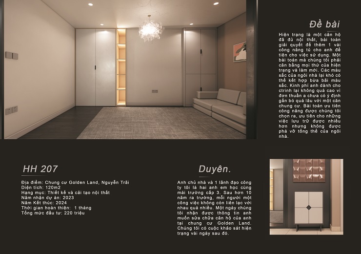 Hiện trạng là một căn hộ đã đủ nội thất, bài toán giải quyết để thêm 1 vài công nắng tù cho anh để tiện cho việc sử dụng. Một bài toán mà chúng tôi phải cân bằng mọi thứ của hiện. trạng và làm mới. Các mẫu sắc của ngôi nhà lại khó có thể kết hợp bừa bãi màu. sắc. Kinh phí anh dành cho ctrinh lại không quá cao vì đơn thuần a chưa có ý định gắn bó quá lâu với một căn chung cư. Bài toán ưu tiên. công năng được chúng tôi. chọn ra, ưu tiên cho những việc lưu trữ được nhiều hơn nhưng không được phá vỡ tổng thể của ngôi